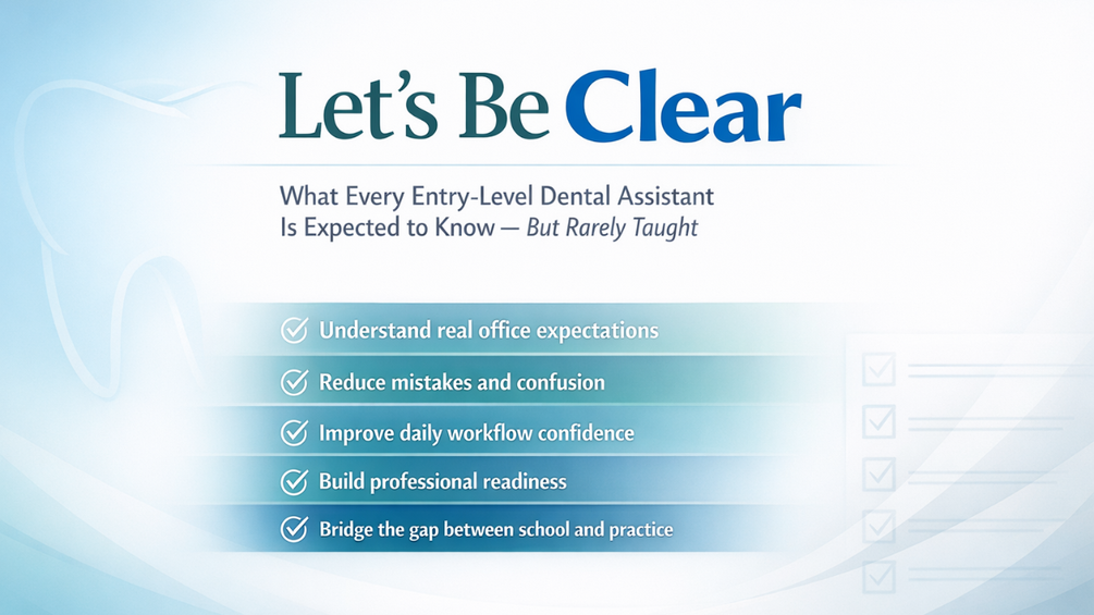 Let’s Be Clear was written to bridge the gap between what is taught in programs and what is expected in real dental offices.